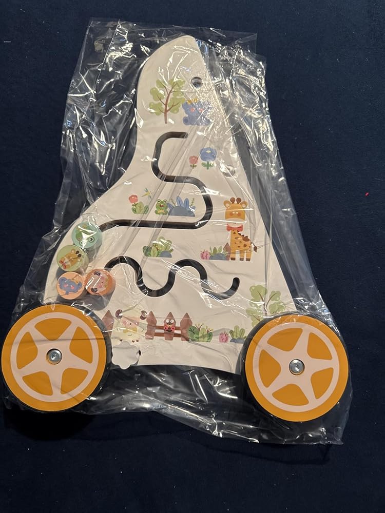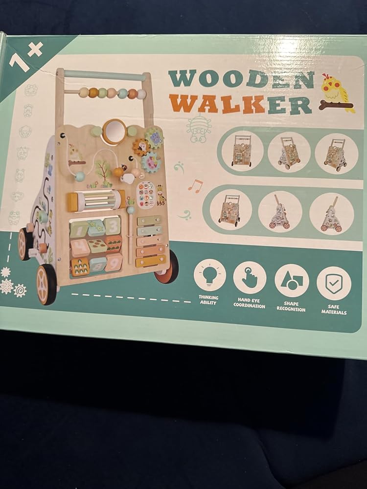 The baby wooden push walker is for toddlers 1-3 years old. It is made from premium wood & hold up to 8.4 lbs this educational walker helps toddlers with sensory, and fine motor skills. The walker height is adjustable allowing it to grow with your child. The rubber wheels allow the walker to be safe, sturdy and reliable. The walker was very easy to assemble. The price for the walker was reasonable being the quality of educational teaching a toddler receive while playing and having fun.